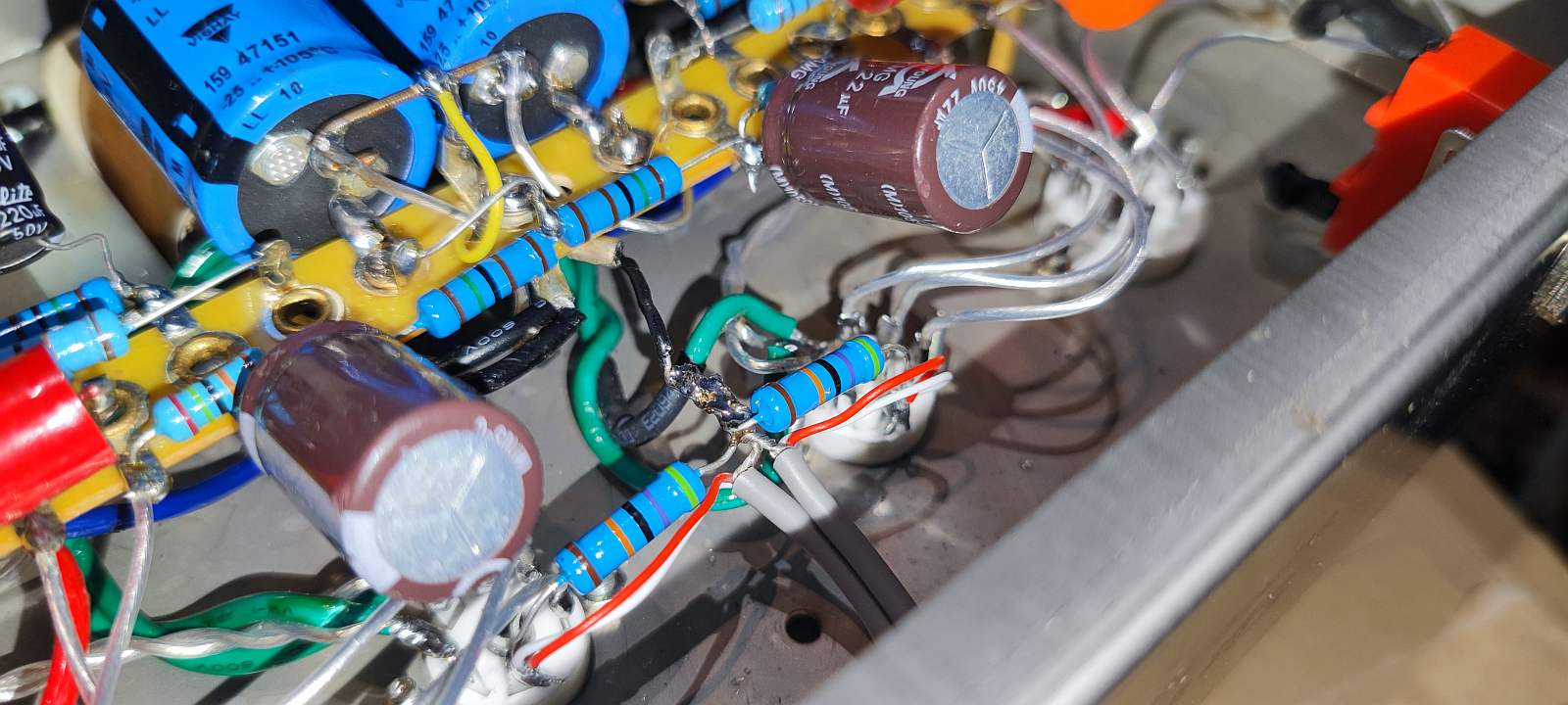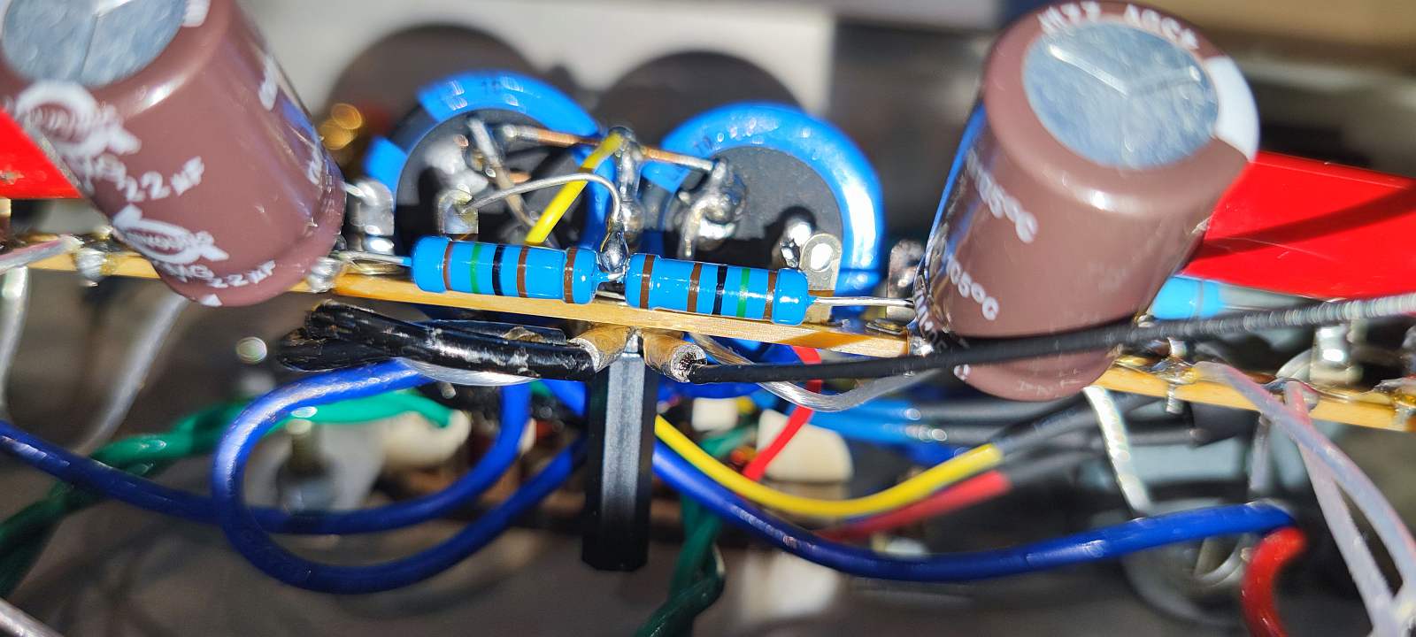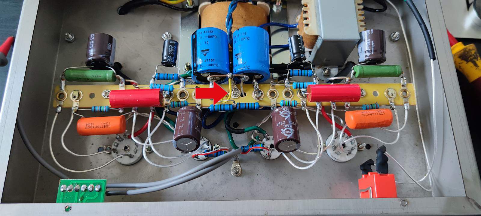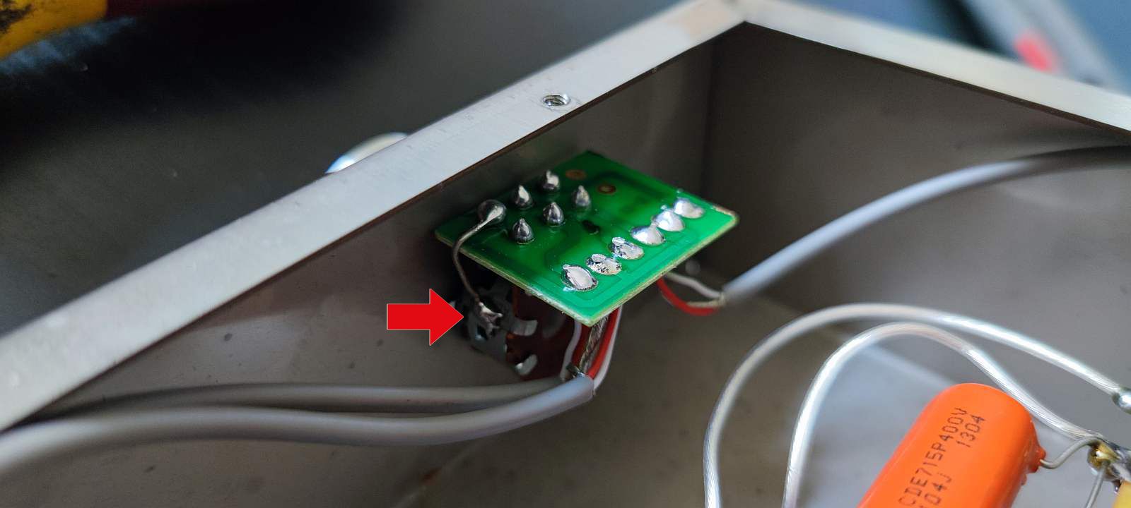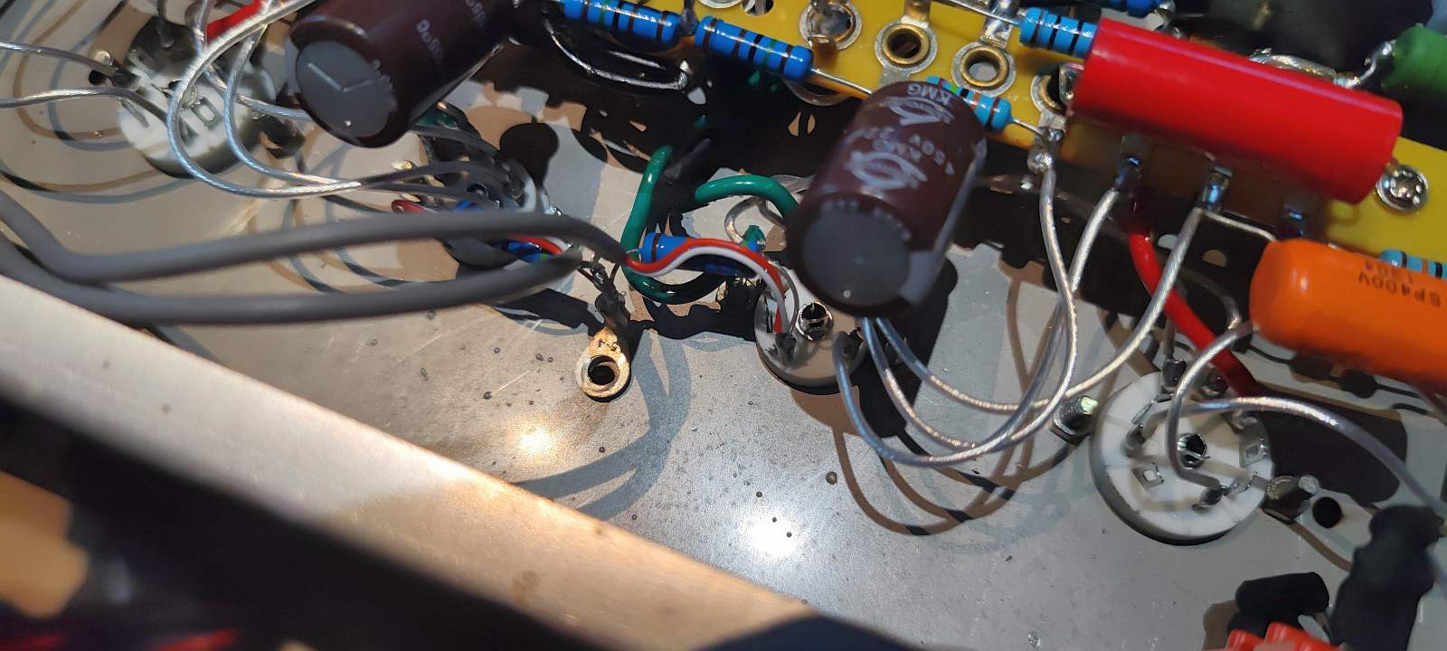 Als letztes habe ich noch die angelötete Drahtbrücke vom Lautstärkepoti entfernt. Davon habe ich versäumt, ein Foto zu machen. Aber man kann sich ja vorstellen, wie das ohne die Brücke aussieht  .