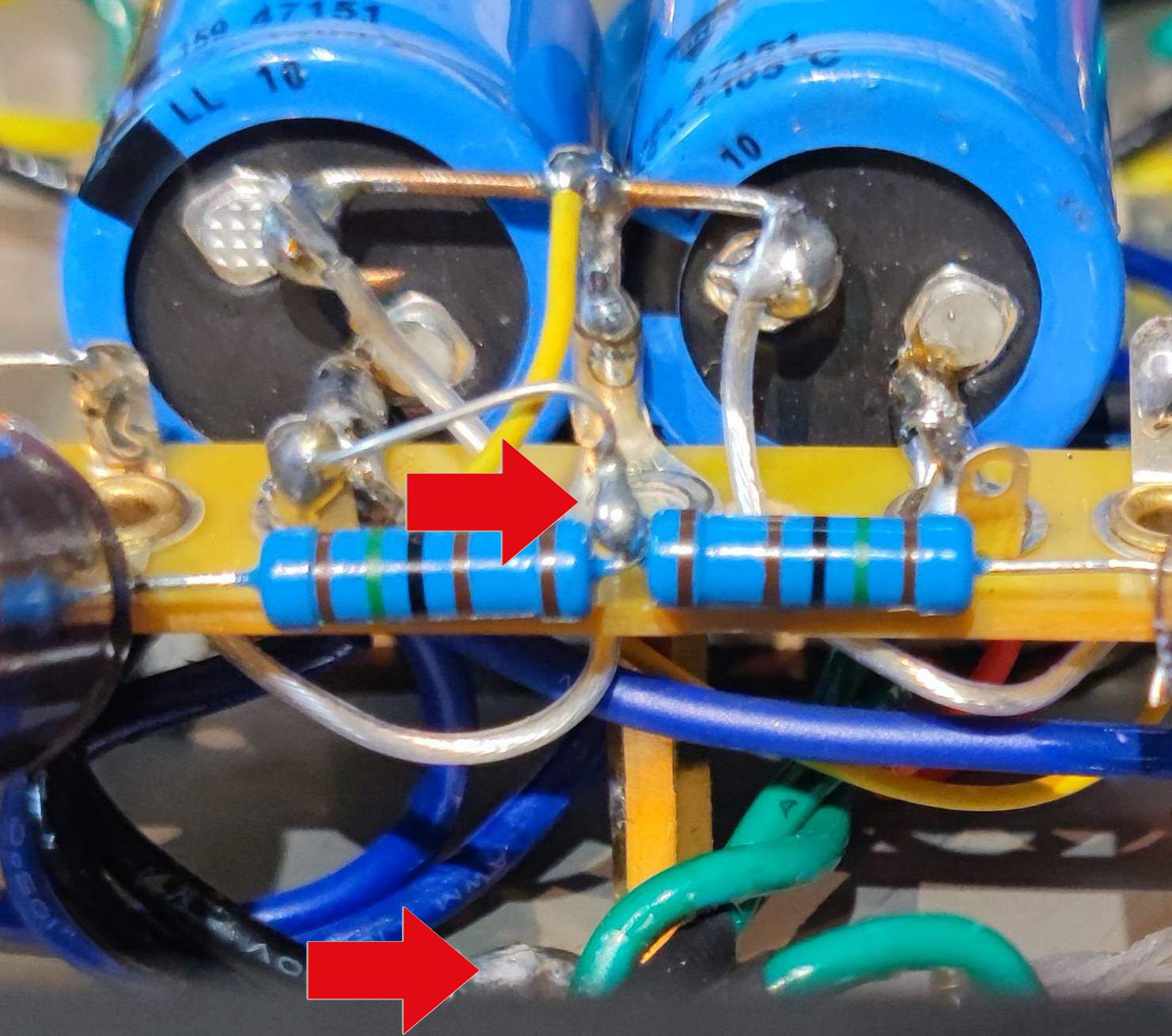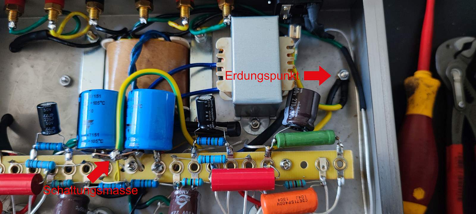 Nun haben wir bei einem Röhrenverstärker einen Sonderfall, da es im Gerät einen Transformator gibt (galvanische Trennung) UND es auf der Sekundärseite des Trafos keine Kleinspannung gibt. Weiter ist die Schaltungsmasse über die RCA Buchsen nicht berührungssicher nach außen geführt. Wenn man nun annimmt, dass es intern einen Leitungsschaden gibt und die positive Versorgungsspannung am Gehäuse anliegt, passiert erstmal nichts. Der angeschlossene Schutzleiter zieht die Spannung auf Erdpotential und die Spannung zwischen Gehäuse und Erde ist 0V. Durch die galvanische Trennung des Netztrafos fließt kein Strom. Soweit so gut. Wenn man nun aber an einer Cinchbuchse die Masse berührt und gleichzeitig das Gehäuse kann dort ein Fehlerstrom fließen und man bekommt einen elektrischen Schlag. Demzufolge werde ich den Sternpunkt der Schaltungsmasse mit dem Erdungspunkt im Gehäuse verbinden. Dadurch ist dieser Fehlerfall nicht mehr möglich.