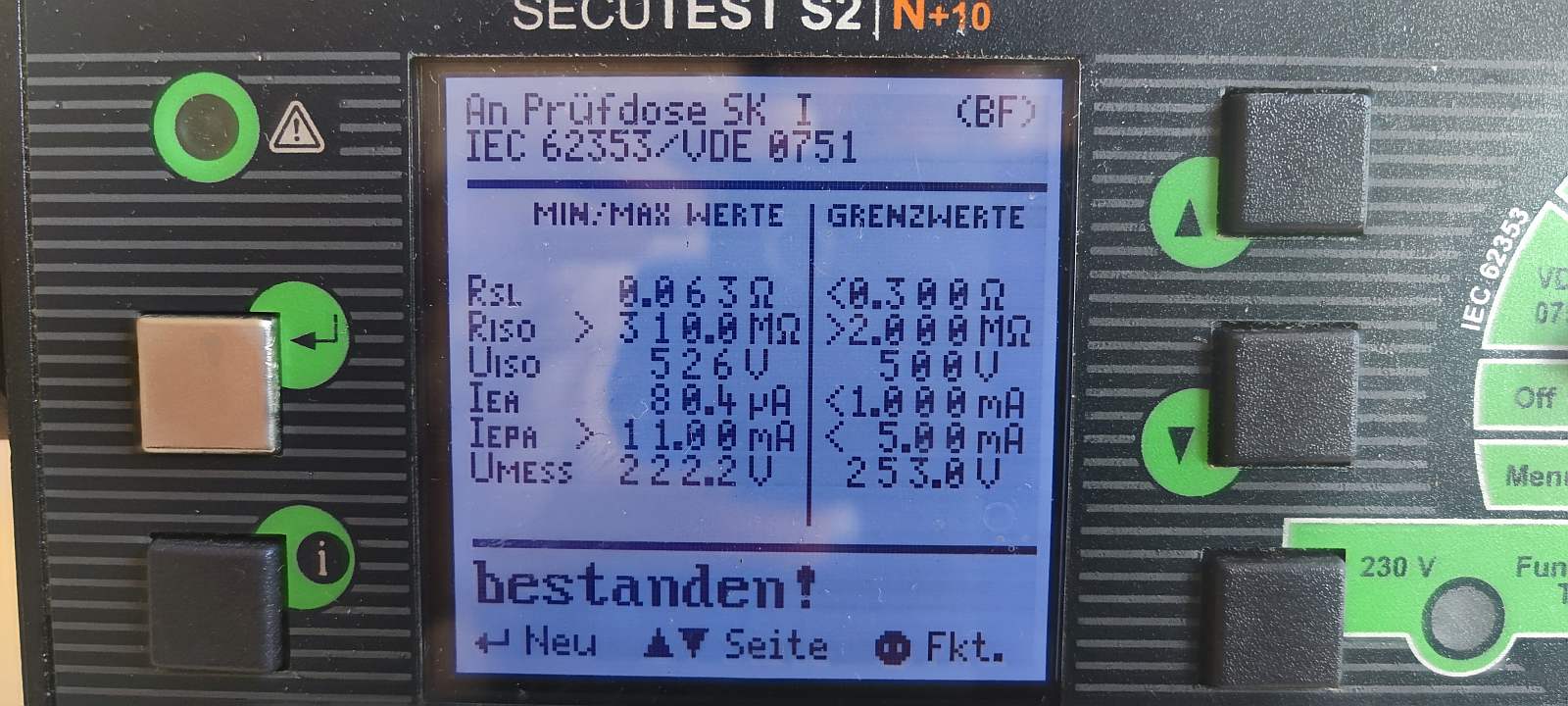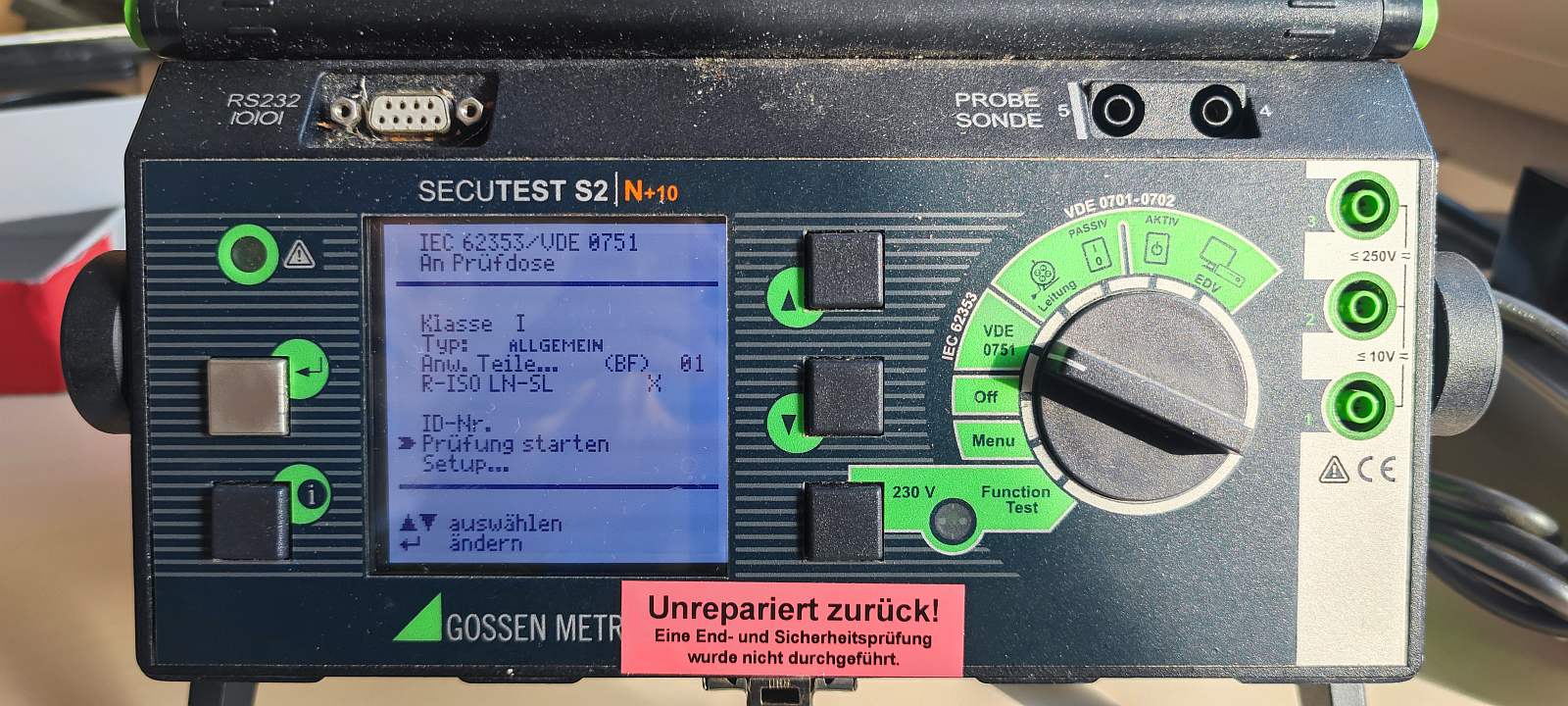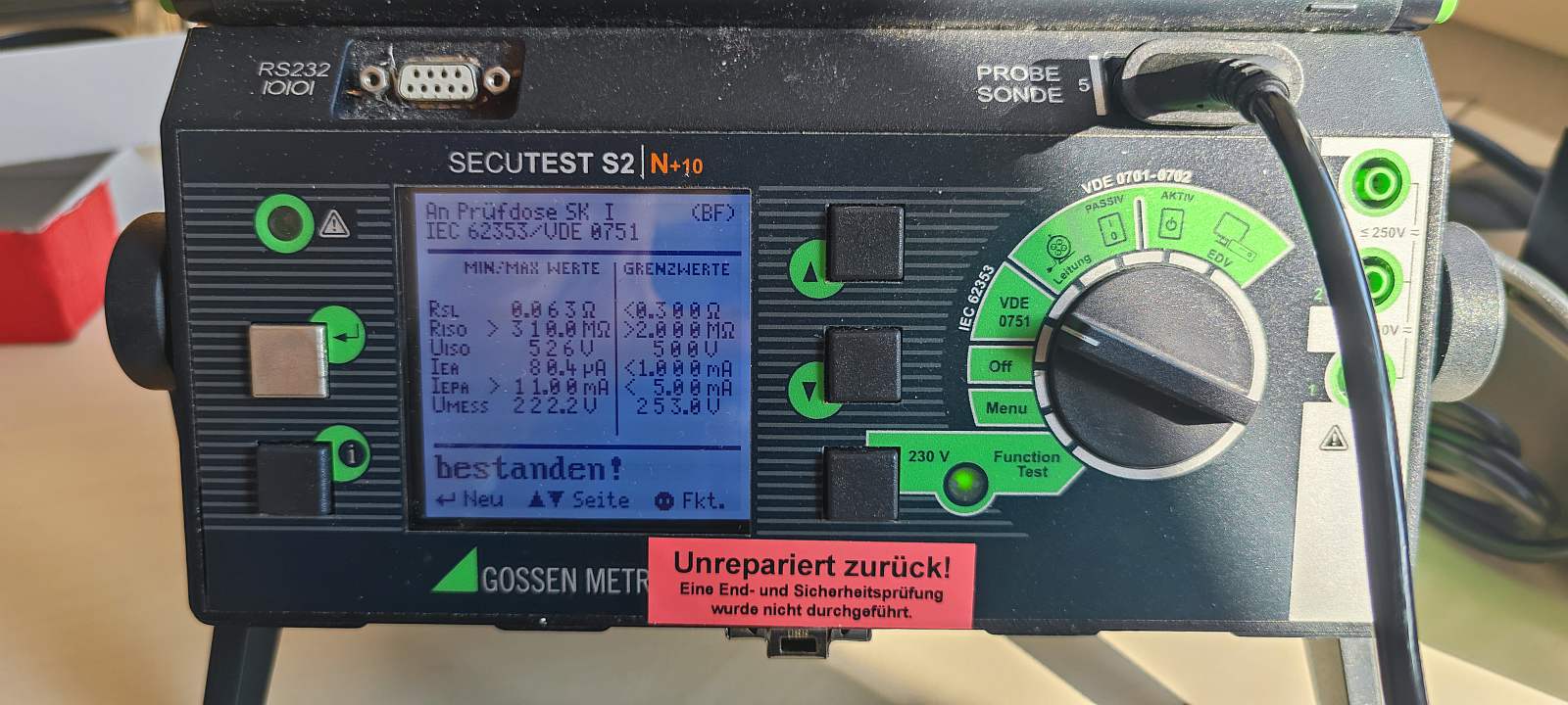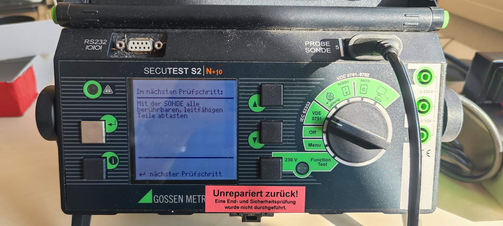 Nach Rücksprache mit unserem Elektromeister habe ich die Messung nach DIN 0751 (Standard für Medizinische Elektrogeräte) durchgeführt. Los geht's.